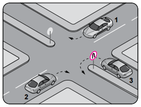 Trafik uygun olsa bile şekildeki kavşakta, hangi numaralı araçların ok yönündeki hareketi kesinlikle yasaktır?