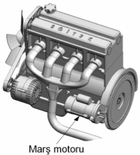 Şekilde gösterilen marş motorunun görevi nedir?