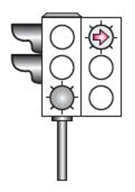 Şekildeki ışıklı trafik işaret cihazında, yeşil ışık ve kırmızı oklu ışık birlikte yanmaktadır. Bu durumda sürücülerin aşağıdakilerden hangisini yapması yanlıştır?