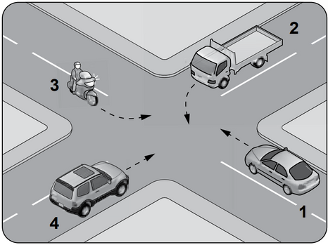 Şekildeki kontrolsüz kavşakta ilk geçiş hakkını hangi numaralı araç kullanmalıdır?