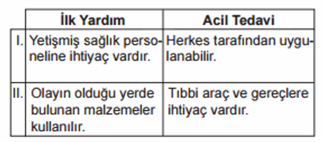 İlk Yardım ile Acil Tedavi arasındaki farklarla ilgili olarak tabloda verilen bilgiler için ne söylenebilir?