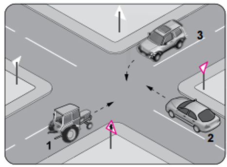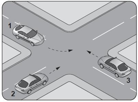 Şekildeki kavşakta karşılaşan araçların geçiş hakkı sıralaması nasıl olmalıdır?