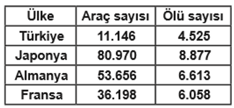 Tabloda trafikteki araç sayısı ve bir yıl içindeki trafik kazalarına bağlı olarak ölen insan sayısı verilmiştir.